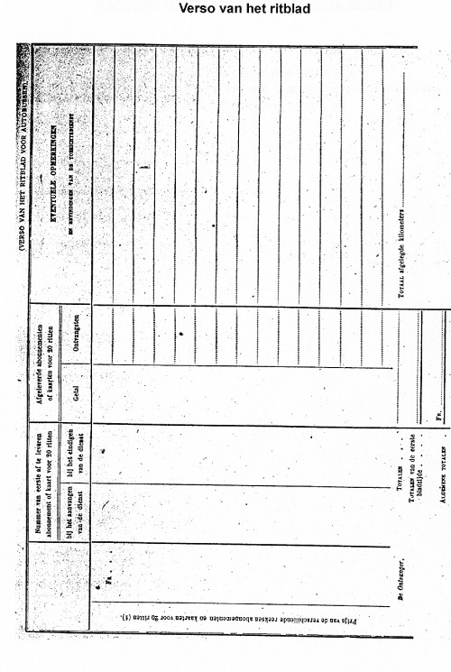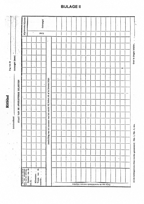 Op de ritbladen van bijgaand model (bijlage II), moet na iedere enkele rit, het nummer van het eerste voor de daaropvolgende rit af te leveren biljet ingeschreven worden.