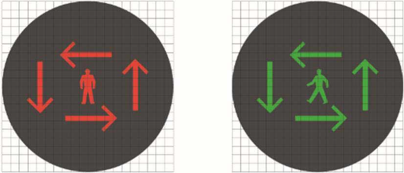Het silhouet van een voetganger dat op de voetgangerslichten en de voetgangerslichten met pijltjes is afgebeeld, staat op een matte zwarte cirkelvormige oppervlakte met een diameter van: