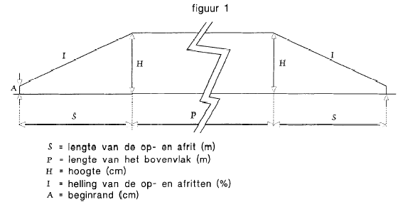 - Het lengteprofiel van dit verkeersplateau is gevormd door een vlak verhoogd gedeelte en op- en/of afritten. Het is van trapezoïdale vorm, conform figuur 1 van deze bijlage.