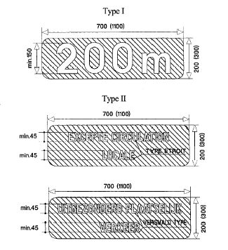 a) De verkeersborden van het model F79 tot F85 worden geplaatst op een afstand van 1.000 m tot 800 m en herhaald op 250 m.