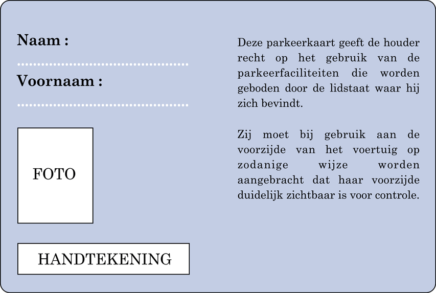 De kaart is strikt persoonlijk; zij mag enkel gebruikt worden wanneer de titularis vervoerd wordt in het voertuig dat geparkeerd wordt of wanneer hij zelf dat voertuig bestuurt.