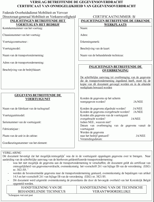 In het geval dat de overbrenging van de gegevens niet mogelijk is, moet de erkende werkplaats een certificaat van onmogelijkheid van gegevensoverdracht waarvan het model op bijlage IV van dit besluit staat, in tweevoud opstellen.