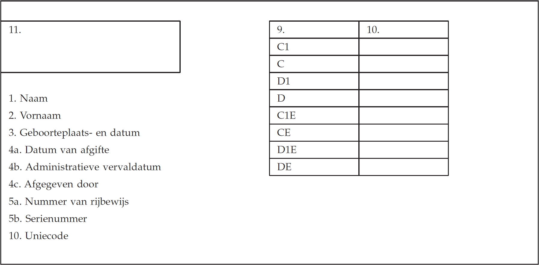 - 9. de categorieën voertuigen waarvoor de bestuurder aan de verplichtingen in verband met basiskwalificatie en nascholing voldoet;