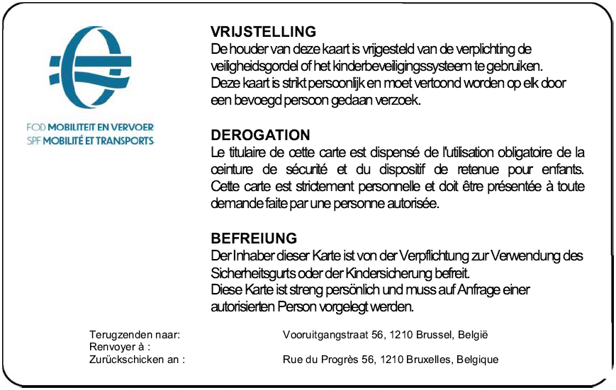 § 4. In afwijking van § 1 kan een vrijstelling schriftelijk aangevraagd worden, per brief gericht aan FOD Mobiliteit en Vervoer, dienst Rijbewijs, Vooruitgangstraat 56, 1210 Brussel.